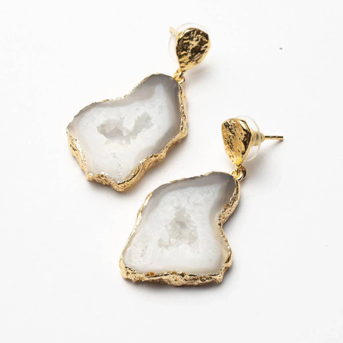 Unieke oorbellen ontworpen met een geode steen als middelpunt. De geode, met zijn variabele vormen en maten, maakt elk paar oorbellen tot een onherhaalbaar stuk, dankzij de natuurlijke kenmerken van de steen die speciale texturen, aders en schitteringen op het oppervlak onthullen.