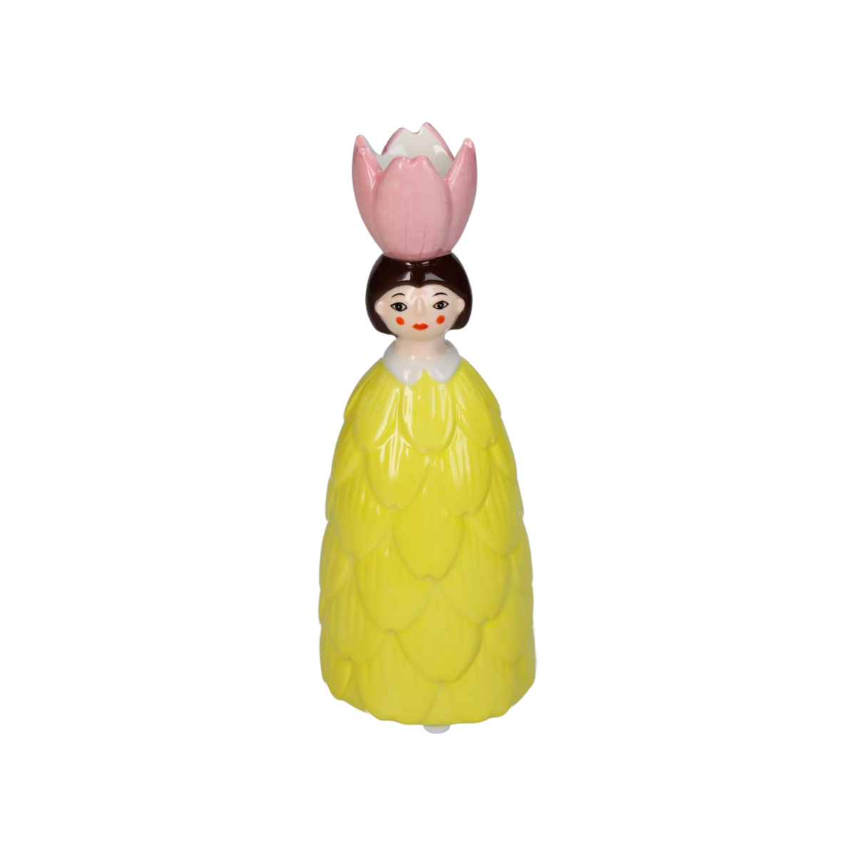 Instant vrolijk word je van deze kandelaar in de vorm van een bloemenmeisje! Met haar bloemenjurk en een tulp als kaarshouder is ze een echte blikvanger op tafel of in een open kast.