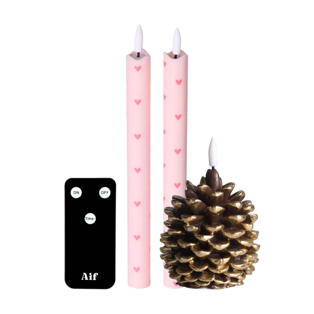 • Complete set: 2 LED dinerkaarsen in Hearts Pink design + 1 LED dennenappel