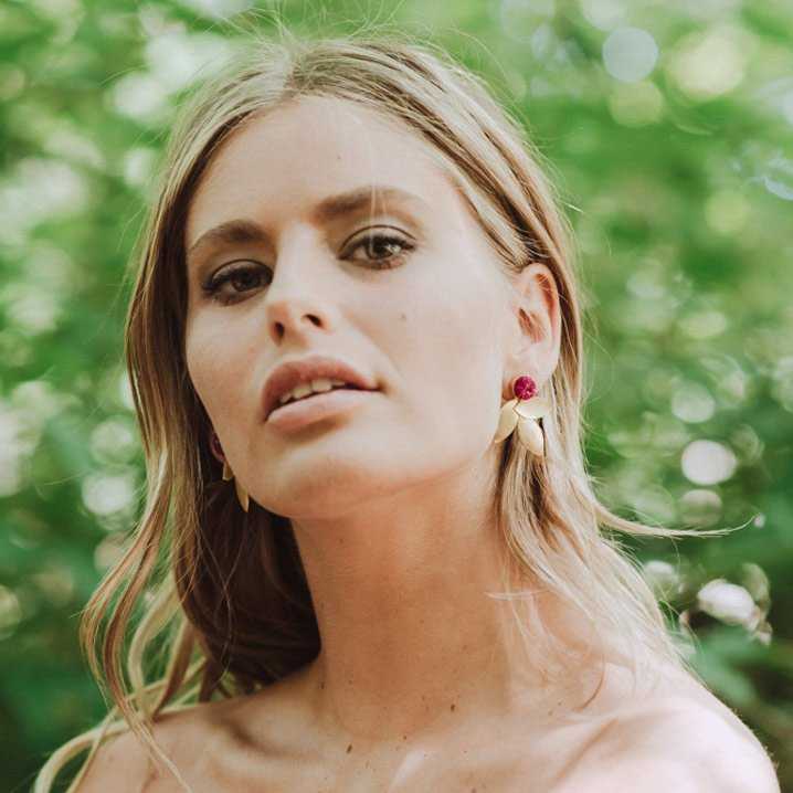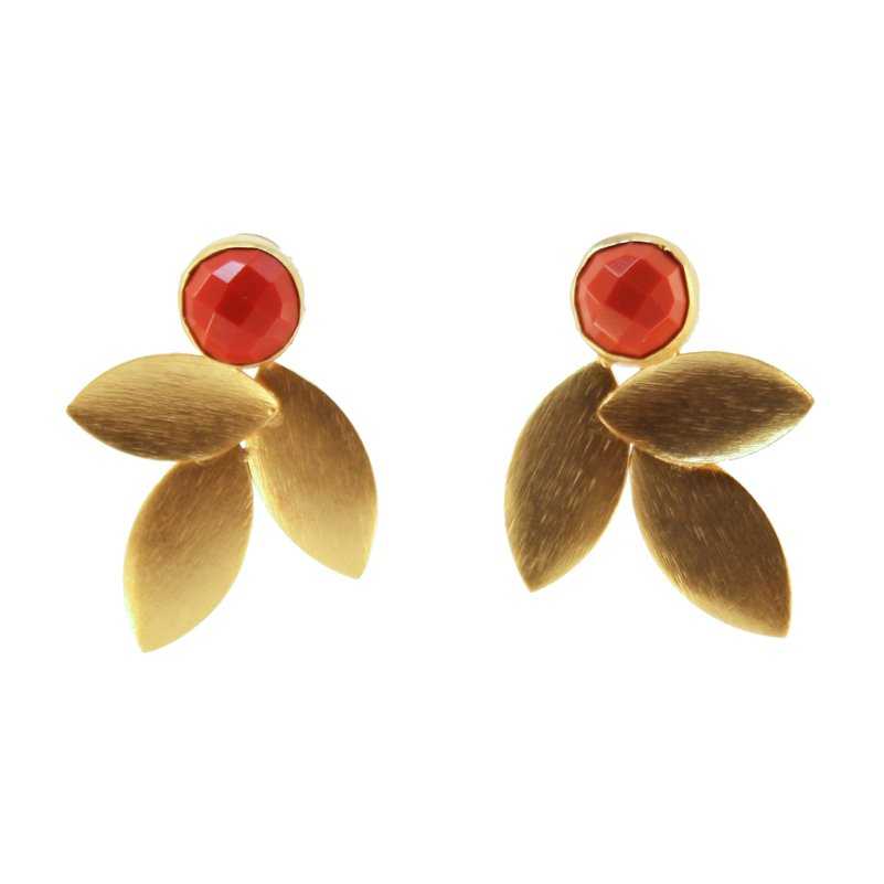 Deze oorbellen worden ambachtelijk vervaardigd door een lokale goudsmid in Spanje. Elk paar bestaat uit drie verfijnde blaadjes met een glanzende, ronde natuursteen in het midden, een subtiel eerbetoon aan de natuur.